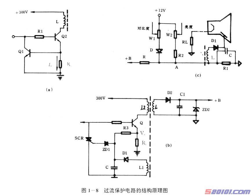 电源开关管的过流保护还常采用图1—8(b)所示电路。当开关管Q工作电流超过设定值,Vc电压会使门限稳压管ZD1击穿,触发可控硅SCR导通,使开关管关断,实现了过流保护。行输出管的过流保护电路与电源开关管的过流保护基本相同,区别是没有中间的分流过程,而是在行电流超过设定值时,电子开关动作使行激励信号旁路,使行振荡器停振来实现行管的过流保护。