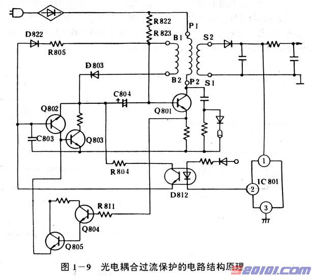 图1—9是松下M16机芯的具体过流保护电路。设开关变压器初级绕组Pl至P2间的电压为V1,流过绕组的电流为I2,则有:V1≌V2XI2.当负载失常而出现过载电流时,初级线圈上的电流I1,也将随之增大。由于I1,增大,Q8Ol(开关管)的发射极电流Ic将增大,而导致Q804基极电压升高,并迅速导通。此后,Q805、Q803也将导通,Q80l基极电流减小,集电极电流受到限制,从而保护了开关电流的主件—开关管Q80l。
