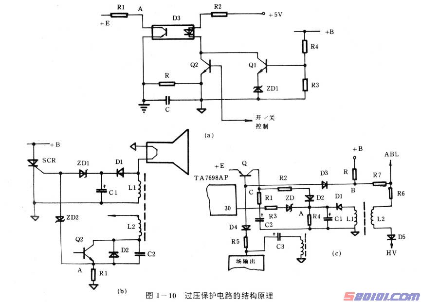 在图1一l0(b)所示的过压保护电路中,L1为行输出变压器灯丝绕组,当其电压超过设定值时,经D1整流、Cl滤波后的电压使稳压管ZDl击穿,可控硅导通,引起电源过流保护而切断输出。该电路的特点是:既可对行输出变压器高压进行间接监测,实现X射线保护;又可对灯丝电压进行监测,防止灯丝电压过高,造成显像管加速老化。图中的ZD2支路为行管Q2的过流保护电路。当行管过流,ZD2击穿,同样使可控硅导通,转为电源的过流保护。还有一种常采用的保护方法,是利用集成电路芯片所具有的专用引脚来实现保护,如夏普机芯中IX0065(9)脚、东芝两片机中的TA7698(30)脚、汤姆逊TEA2026(28)脚等。在现行的遥控彩色电视机中,常利用微处理器芯片的某引脚进行过压采样和过压控制。下面以东芝TA7698芯片为例,说明负载电路过流过压保护的原理。 [Page]