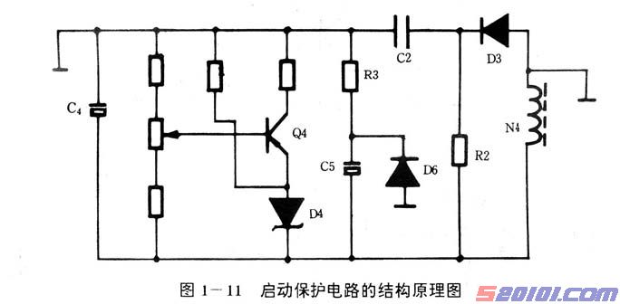 在开关稳压电流中,刚开机的瞬间,由于输出端的电压尚未建立,处在欠压状态,电流很大,对可靠性不利,因此常设置软启动保护电路。软启动电路的作用是在启动过程中,从适当部位引入一定的信号,迫使导通时间变短,降低Io。由于导通时间短,每个周期提供的能量小,需要更多的周期才能建立起正常电压,亦即减缓了启动速度,故称为软启动。典型的彩色电视机软启动电路见图1—11所示。