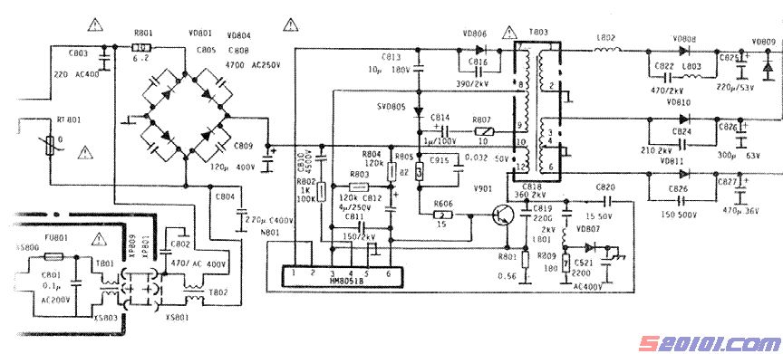 容 C809 两端电压 300V;若 C809 两端有 300V 电压,则是开关变压器的(10)~(12)绕组断或 其脚虚焊;若 C809 两端无 300V 电压, 则是整流以前电路有断路, 如 R801、电源线、开关 等有断路现象。如果开关管集电极有 300V,电路又起动频繁,一般是负载短路引起。如果 电源不起动应检查 R804、C814、C812、R807、R806、R805, 这些元件如无损坏,应检查开 关管 V901、R808 及 HM8951B、VD805。