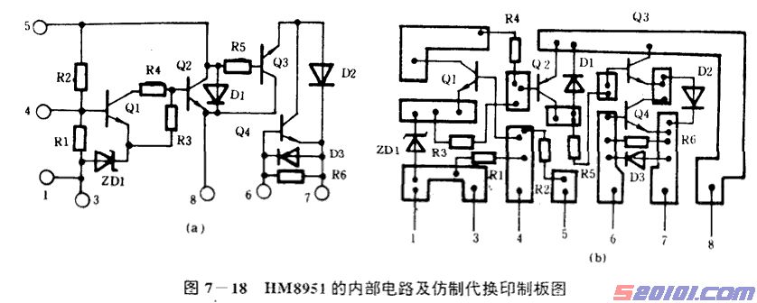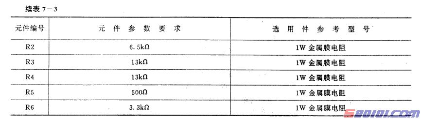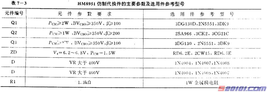 若无上述代换件, 则可采用分立元件进行仿制代换, 其仿制印制板图见 7 一 18(b)。其中 各代换件的参数要求及选用件的参考型号见表 7—3 所列。
