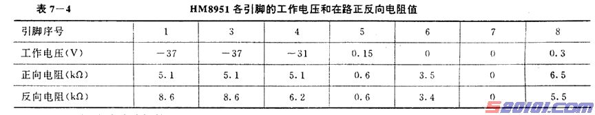 电源厚膜块 HM8951 正常工作时,各引脚的工作电压和在路正反向电阻值见表 7—4 所 列(采用 MF10 万用表在北京 8316 机上测得)。