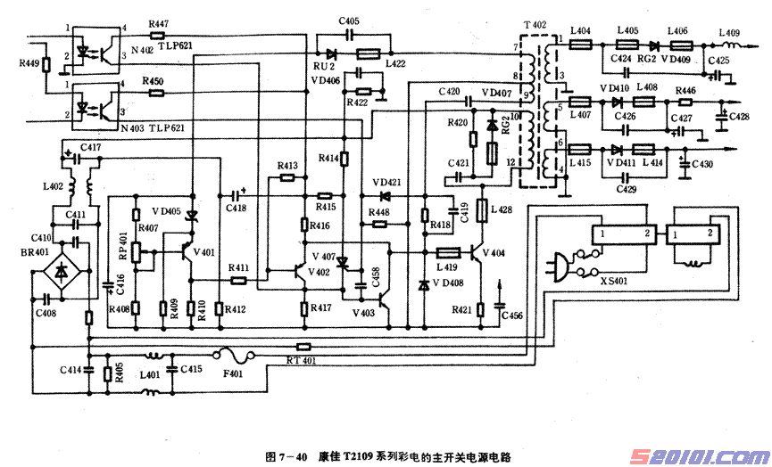 康佳 T2109、T2109A 机所采用的电源电路与 T953S 和 T953P 机基本相同,由遥控变压 器(副电源变压器)T410 提供-30V、+11V、+5V 三种电压,分别供存储器 N202、开机及保护