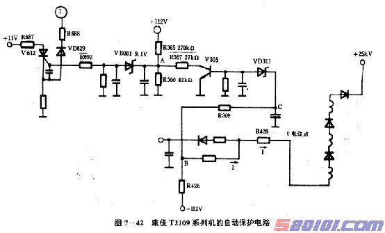 (4)自动保护过程 在该系列机的电源电路中设有过压、过流及束电流等保护电路,其电路见图 7—42 所