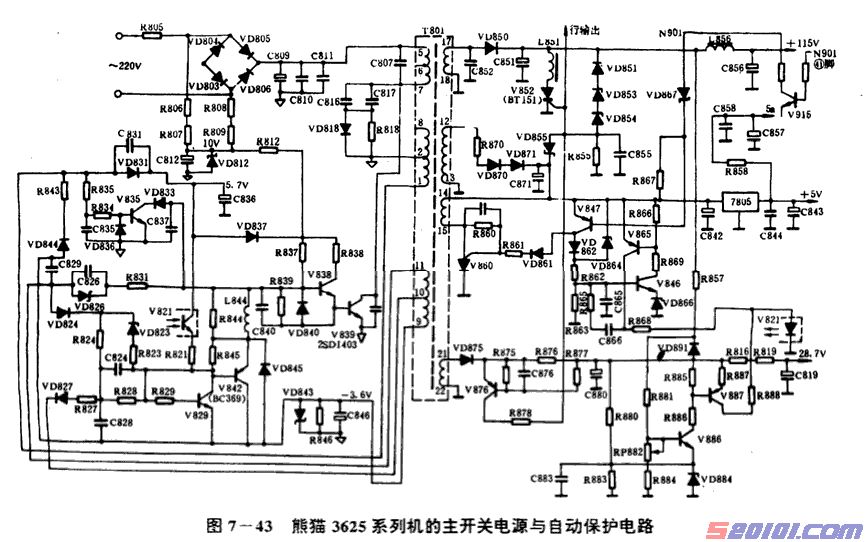 熊猫 3625、虹美 5456、百花 SBCT-541 及环宇 54C-3RA 型系列彩色电视机的主开关电 源与自动保护的电路构成相同。具体电路见图 7-43 所示(以熊猫 3625 型机为例)。