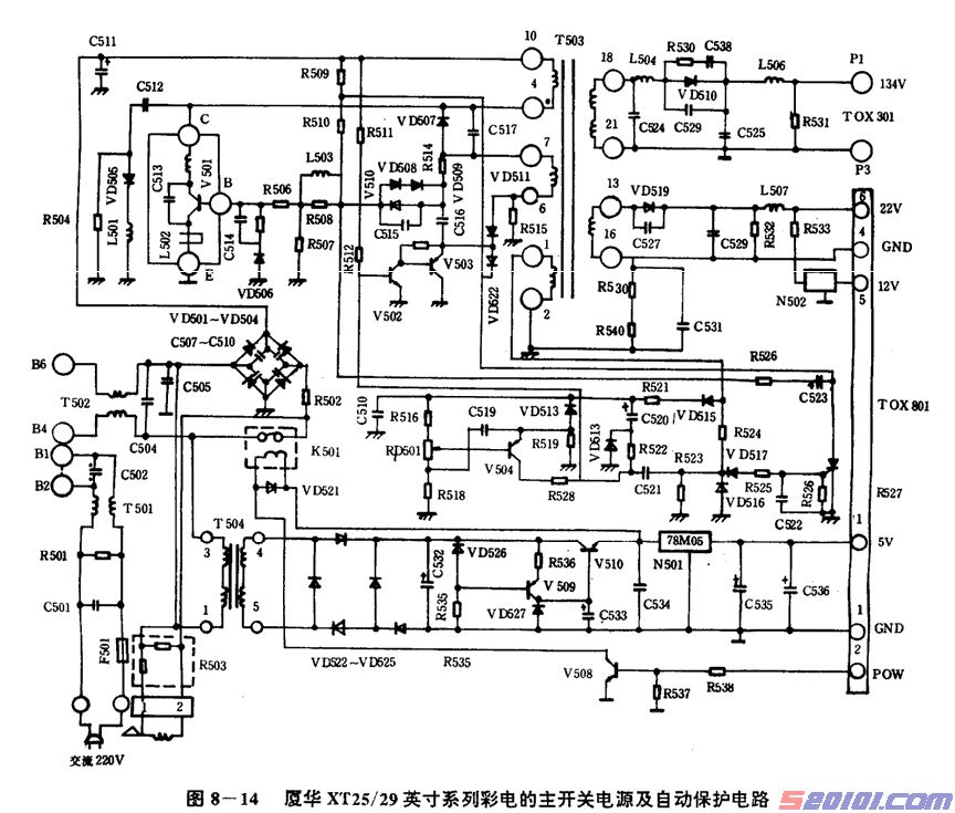 过电压保护电路由可控硅 V505、D512、D517、R525~R527、C523、C522 等元器件组