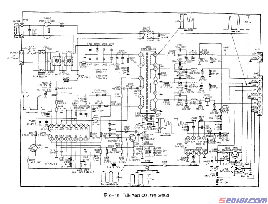 可以断开各路负载后单独检修。Q802 为电源开关管,IC801(TEA2261)是激励集成电路,Q801 为稳压放大管,VR801 为输出功率调整,T802 为外同步耦合器,IC802(TEA5170)为脉冲整 形放大集成块,VR851 为输出电压调整,在正常情况下,只要合上总电源开关 SW801,无 论二次电源是否开启,开关电源就应当工作,+B(120V)、24V、5V 三路电压均应正常建立。