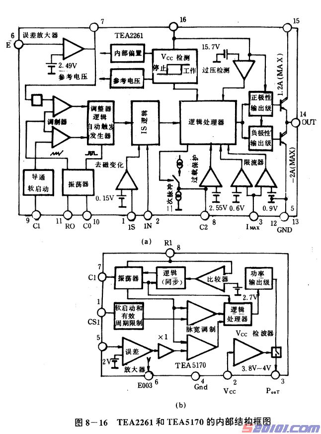 如图 8-16(a)所示,TEA2261 的(16)脚为 Vcc 电压端,其内部设有电压检测装置,使之 在供电电压小于 7.4V 时停止工作,只有供电电压大于 10.3V 时才开始工作;此外还有过压 检测电路,一旦供电电压超过 15.7V 便启动保护电路,切断激励脉冲,停止信号输出。(15) 脚为集成电路输出级的独立供电端。(14)脚为激励脉冲输出端,根据不同的接法(选择地或 V+端为参考点)可输出正极性激励脉冲或负极性激励脉冲。(13)、(12)和(5)、(4)各脚均为接 地端。(3)脚为限流输入端,主要是检测激励脉冲的大小, 若此脚电压大于 0.6V 则停止工作, 大于 0.9V, 则执行保护。正常时应在 0.6V 以下。(8)脚为二次脉冲检测和过载保护检测用的 外接定时电容端。(2)脚为同步脉冲输入端,以外来脉冲作为基准, 确定激励脉冲的起始点。