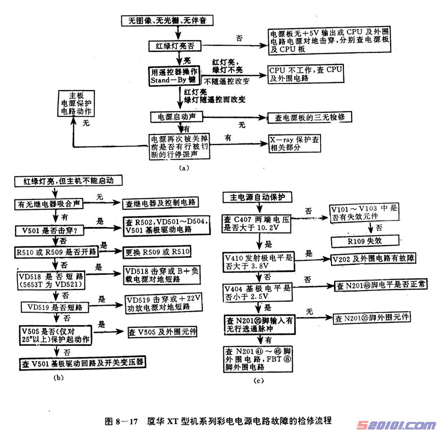 130V 左右,如果+B 很高, 则是电源板出故障;如果+B 正常,则进一步检查行输出电路, 故障元件有:Z202 行振荡晶振(503kHz)失效、C244 失效或 V302 外围电路有问题;若面板 上的绿灯亮, 说明遥控电路的+5V 电压正常,同时微处理器处于正常工作状态, 对此应重点 检查其主电源电路。以上具体检修流程见图 8—17 所示。