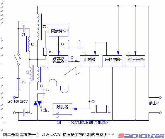 关于交流稳压器的专门资料并不多见,一些维修资料散见于一些杂志和报刊,现在许多 厂家出于一些原因很少配图纸,致使一些电器维修人员对各种稳压器的原理难以获得全面的 了解,常常给维修带来困难。其实,不管是那种类型的交流稳压器,都是由常规的基础电路 所组成,对于基础电路知识较好的电器修理人员,维修并不困难。笔者在实际工作中,结合 具体实物绘制出电路图,并对电路原理进行简要的分析,希望能够给电器维修人员一些参考。 图一是这种稳压器的方框图, T1 为自耦变压器,与铁芯电感 L3 及双向可控硅 SCR 串 联之后接入市电,当市电电压或负载波动引起输出电压变化时,通过采样电路、比较器及触 发器控制双向可控硅的导通角度,改变通过的电流,进而改变补偿电压△U 的大小及相位, 从而达到稳定输出电压的目的。L3 用来平滑可控硅通过的电流波形,L2、C2 组成三次谐波 串联揩振支路,L1、C1 组成五次谐波串联谐振支路,用来滤出高次谐波改善电流及输出电 压波形。为了防止稳压电源失控出现的高压,电路中还设置了输出过压保护电路,通过继电