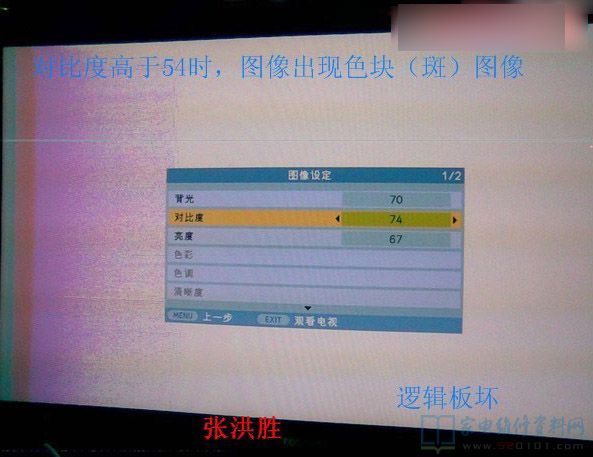 图8、TCL液晶电视对比度高于45时,图象出现色斑(色块)情况 (故障原因:逻辑板损坏)
