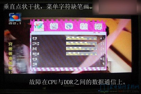 图17、液晶电视有垂直点状干扰,菜单字符缺笔画(故障原因:故障在CPU与DDR之间的数据通信上)