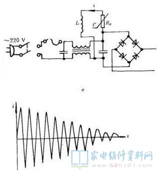 电视机自动消磁电路主要元件是消磁电阻和消磁线圈,两个元件串联后接于电视电源总开关之后的220V交流上,消磁线圈套在彩色显像管外。