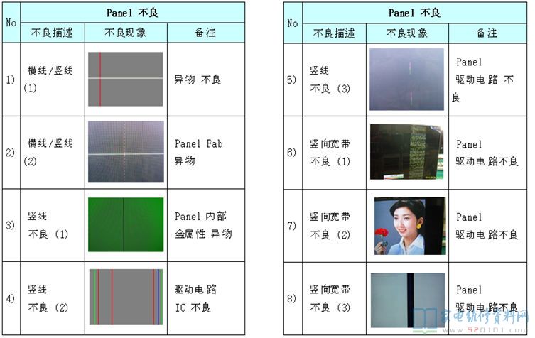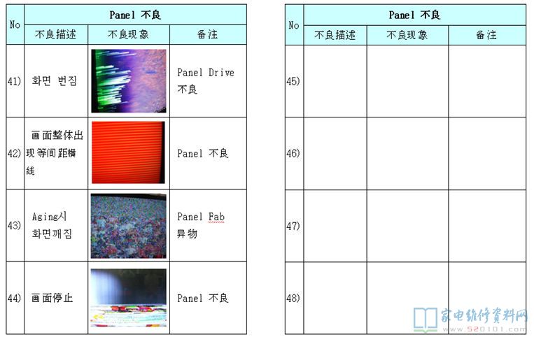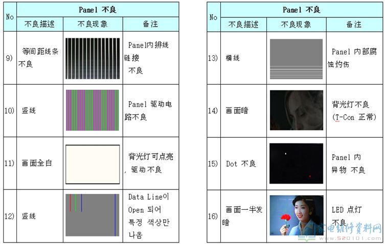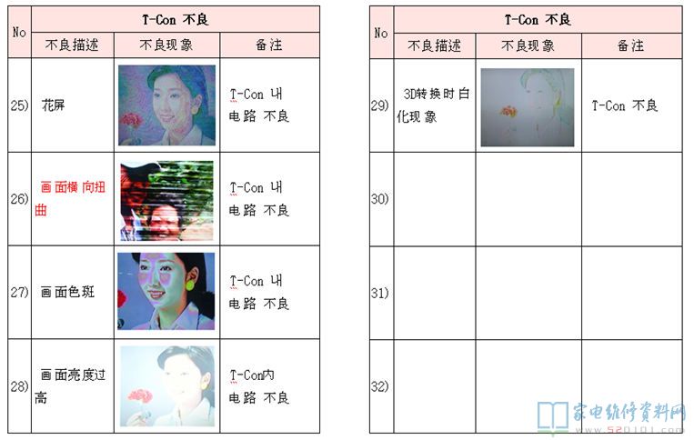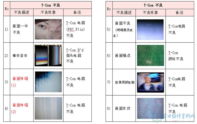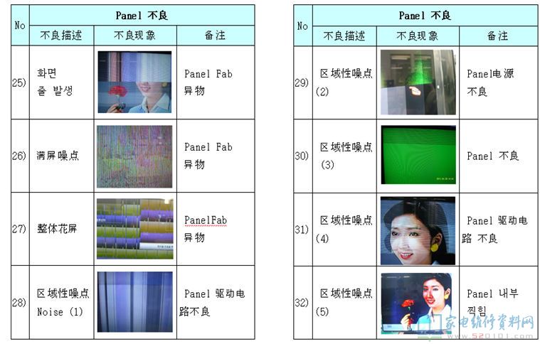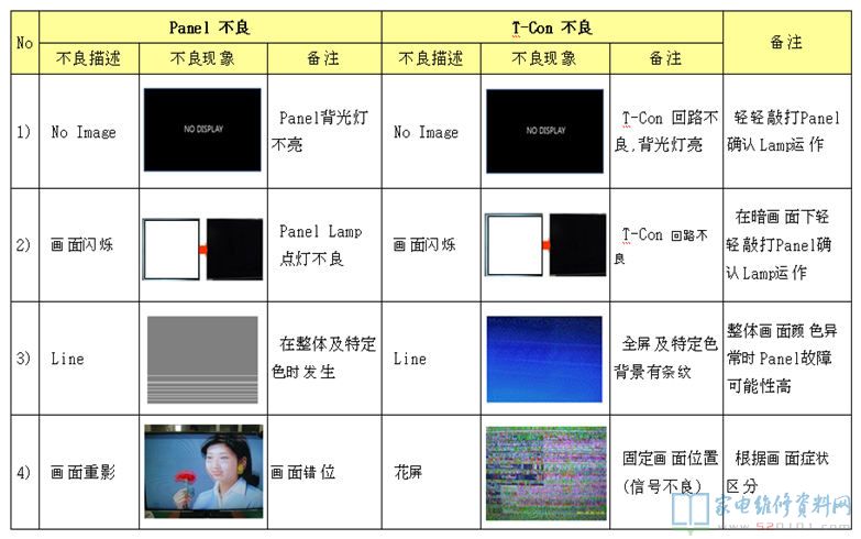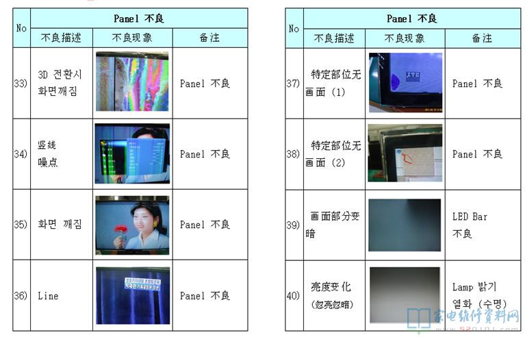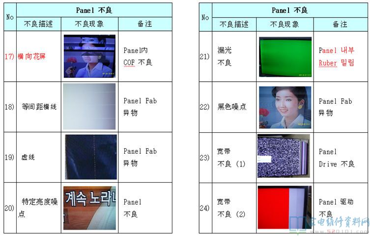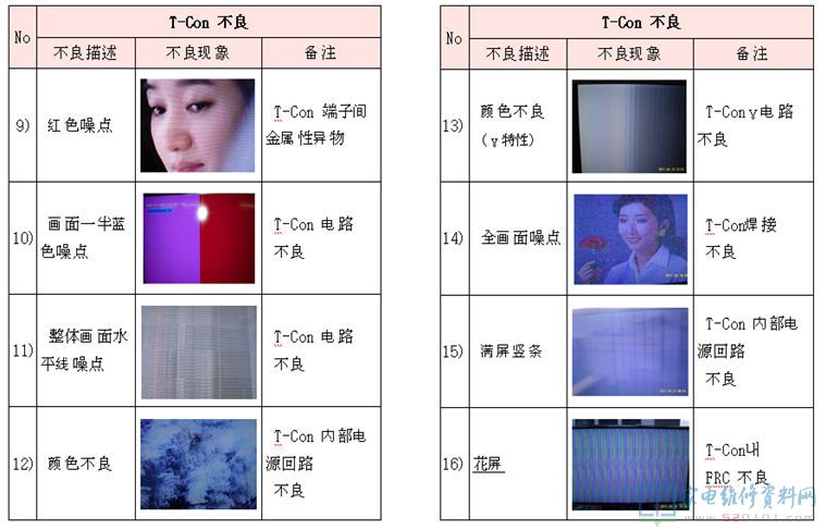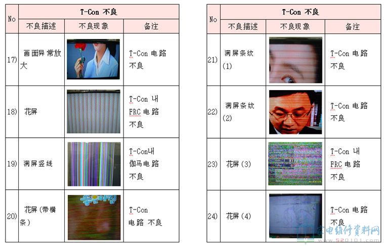 电视机液晶屏及逻辑板不良区分对照 2017-11-03 07:04:21 阅读 430 次 评论 0 条 摘要: 本文是韩资企业内部售后资料,通过故障描述配合实际故障图片对比的方法,详细的阐述液晶电视机的液晶屏与逻辑板分别在发生故障时,它们分别表现出什么的形式,以为您在检修中作为故障判断时有参考。(仅供参考,请您根据实际情 本文是韩资企业内部售后资料,通过故障描述配合实际故障图片对比的方法,详细的阐述液晶电视机的液晶屏与逻辑板分别在发生故障时,它们分别表现出什么的形式,以为您在检修中作为故障判断时有参考。(仅供参考,请您根据实际情况检修,不作为唯一依据) 1、T-con不良 2、Panel不良(非T-con板故障) 版权声明:本文为转载文章,版权归原作者所有,欢迎分享本文,转载请保留出处! 点赞 分享: PREVIOUS:海信TLM42V66PK液晶电源灯亮,但屏不发光 NEXT:三星PS43E400U1R等离子电视不开机,待机电压不稳 文章导航