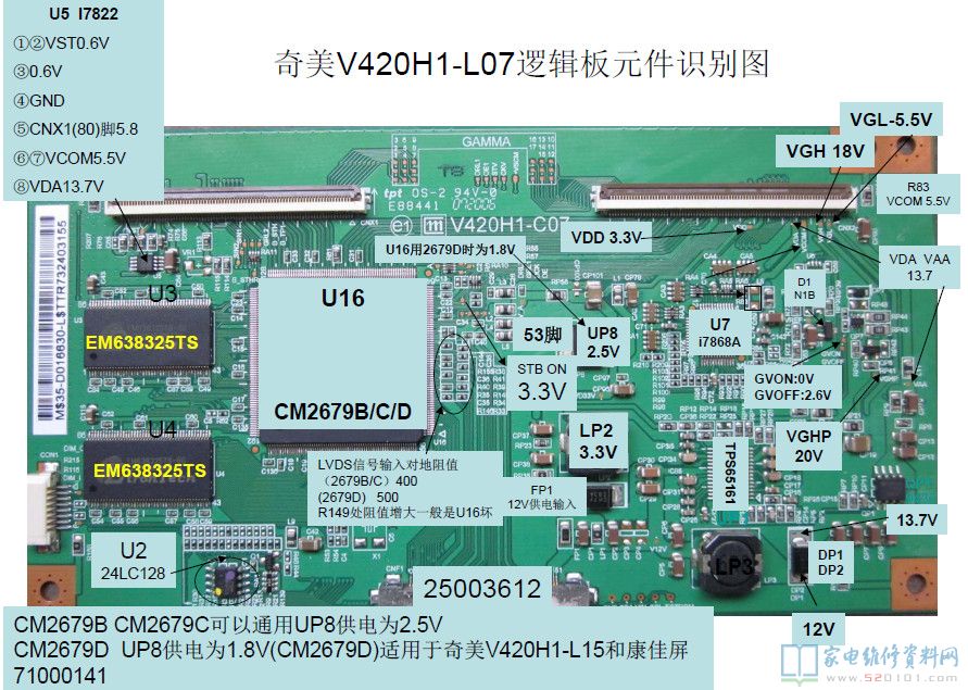 备注:CM2679B CM2679C可以通用UP8供电为2.5VCM2679D UP8供电为1.8V(CM2679D)适用于奇美V420H1-L15和康佳屏71000141