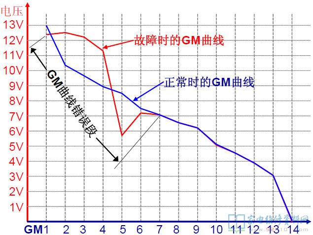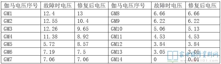 经过对故障板GM检测点的数据实测,并与以往维修时作的正常数据进行了比对,如下表所示。