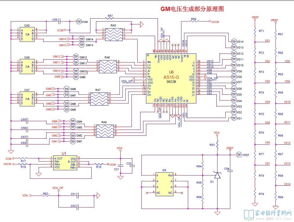 由上图可见,逻辑板上的VREF基准电压通过电阻R71-R79及R81-R89组成的两个电阻串,由高到低分出14路伽马电压,为提高其带负载能力这14路伽马电压被送到U6[AS15-G]内,进行缓冲放大后送到液晶屏。