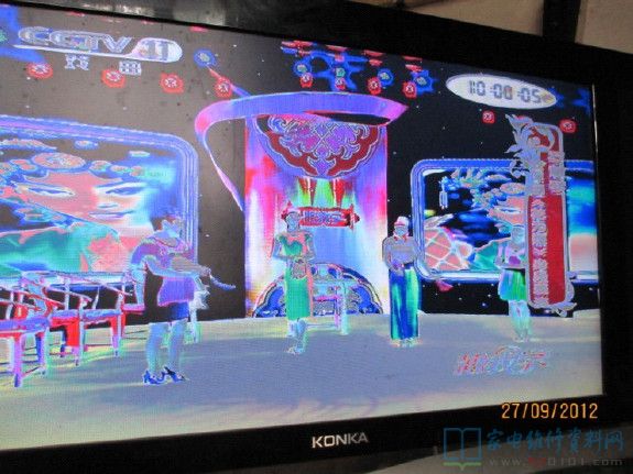 故障分析:首先观察在出现菜单时颜色并无异常,说明主板送到逻辑板的信号是正常的,仔细观察屏幕图像,画面颜色不对,出现彩色镶边,图像层次不明显,由前面的知识我们知道加在液晶分子上的电压是由图像像素信号电压和伽马校正电压相叠加后通过TFT开关加到液晶像素上,控制液晶分子的正确扭曲旋转程度控制屏的透光率再现完美图像的,如果这个电压不正常,加在液晶分子的电压也就不正常,导致液晶分子错误扭曲,再现的图像色彩也就会不正常。