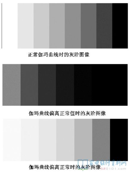 下图最上那个灰阶看,按液晶屏的不同选择合适的伽马校正曲线,就能还原出层次分明的图像。选择的曲线和正常曲线偏离,图像就会层次不分明,缺少层次,还原出的图像不清晰。如下图中的中间和最下一个灰阶图像。