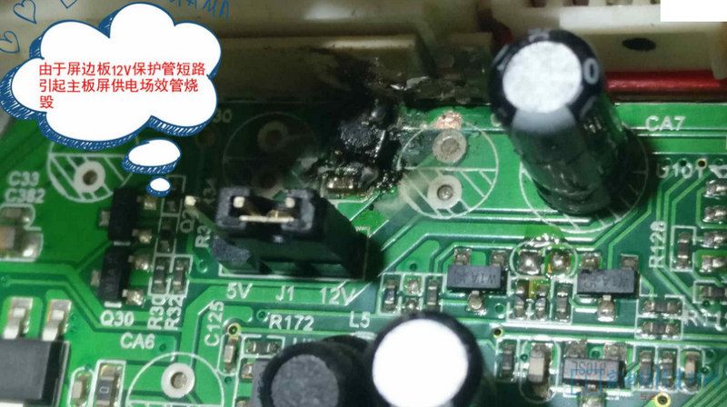 总结:此机是由于电源12V稳压电路出现问题,开机时出现输出电压过高,冲击主板数据受损,击穿屏12V保护二极管,又连带烧毁屏供电场效管。