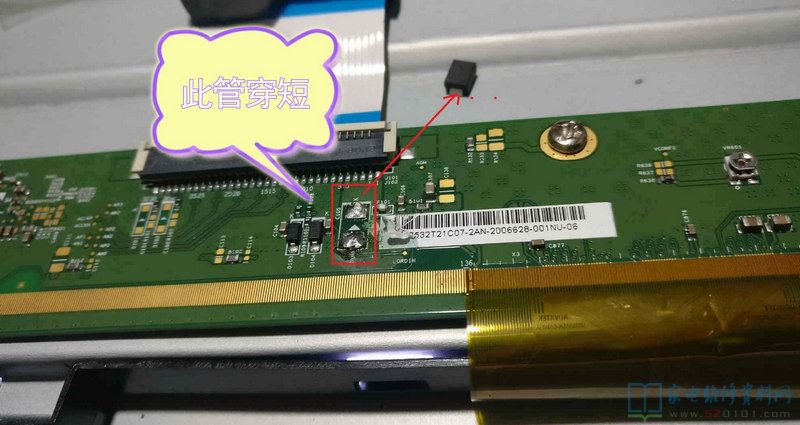又转移到屏边板上来查12V短路点了。仔细看屏边板12V保险完好,而接在屏12V与地之间的一个二极管(标注LS27)烧裂了!拆下测量时发现击穿了!立即装了一个SS14;又在旧板上拆了一个同型号场效管装入主板屏供电12V电路中,再次上电开机,见屏幕亮起,接信号线图声正常,试机十分钟左右,又发现屏幕图像一闪一闪的!声音始终正常。