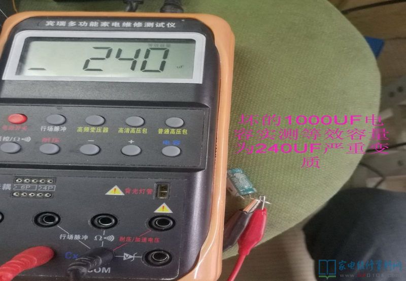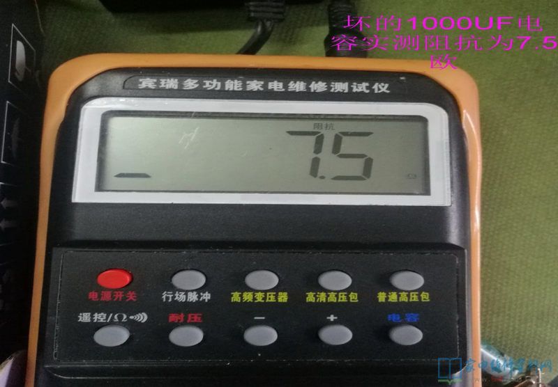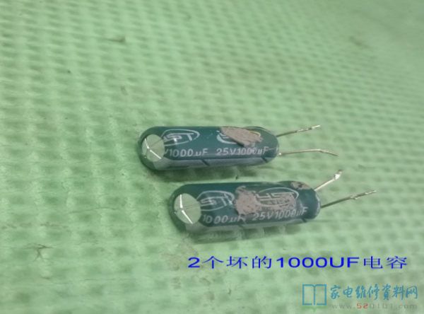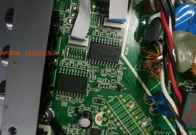 第二天早上再开机时又不行了,还是开机一闪保护,问题究竟在哪里呢?LED没有问题,难道是背光芯片误保护?此机型采用的是2片AP3608 LED恒流驱动芯片,LED分为2路,每一路又有8串组成。插上任何其中一路,都可以开机不再保护,只是有一路LED开机后过10秒钟,闪的厉害,而且开关电源部分响声较大。按理说如果背光芯片周围有问题的话,应该是任何一路都开不起来的,怎么可以开起来呢?还有为什么冷机不行?热机是可以正常开机呢?种种疑问,正在头疼时,忽然发现电源部分的电容有鼓包,仔细一看是12V供电的1000UF滤波电容,因为是卧式安装,不细看还发现不了鼓包,分析了一下此款电视机的图纸,此机的12V供给背光芯片,经A3039A升压后大概35V,供AP3608恒流驱动。12V电容失效后,供电不足,自然就保护了,只工作一路LED时负载不大,可以工作,2路同时工作时,电源供电不足导致保护,还有热机时,12v电容容量有所上升,12V就稳定一点了,LED热态时电流也可以更小一些启动,所以背光就没有保护了;更换此电容后,故障修复。