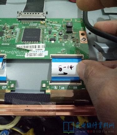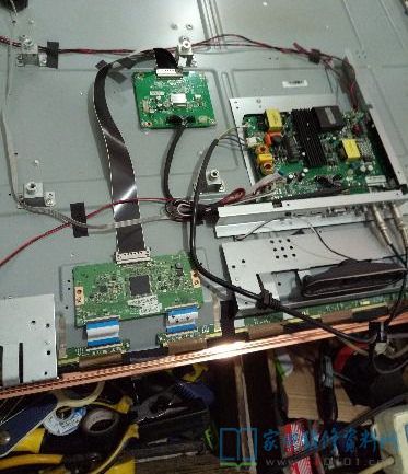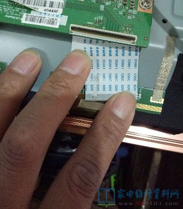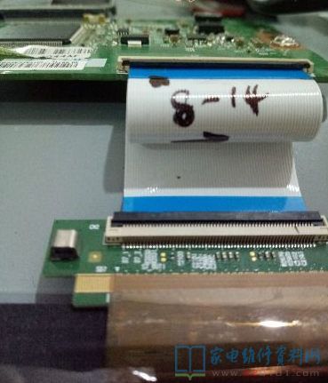 接修一台杂牌EHT49H08(广州瀚丽美)电视,故障是有声音,图像一下正常一下变黑暗拖尾(向下)交替变化(1-2秒正常1-2秒暗屏拖尾),打开后盖电源目测正常,测电压也正常,清洗排线也一样,换逻辑板也一样,怀疑屏边板问题,检查边板贴片电容电阻没有发现问题,最后想到以前用过的排线隔离法试一试,剪一小节透明胶带(3毫米左右)贴在逻辑板到边板的排线上多次移动试机,当贴到右排线8-14线位置时头像正常,长时间试机也正常,到此维修成功。