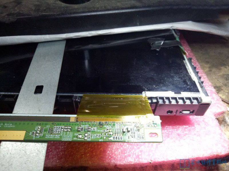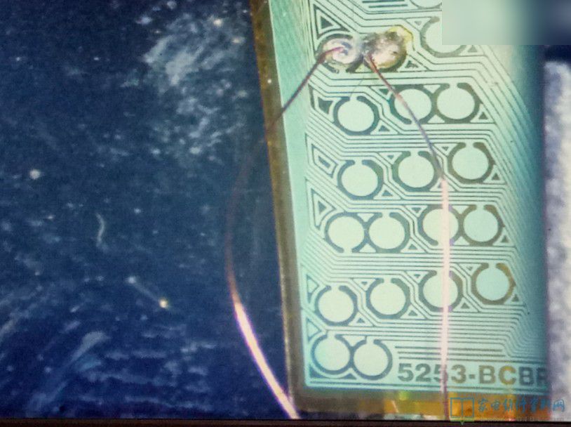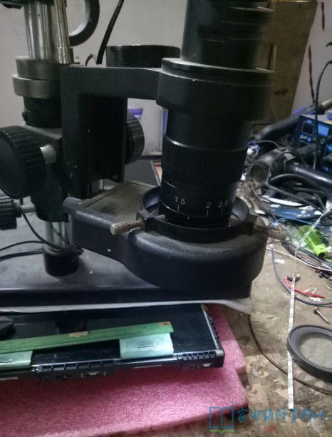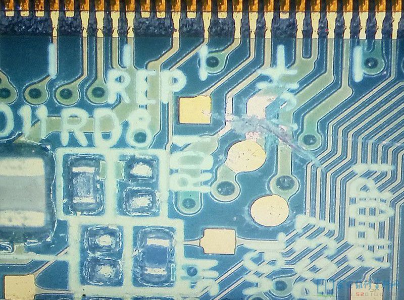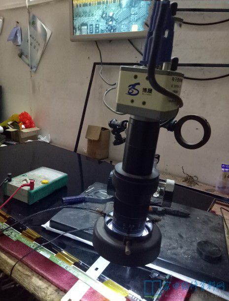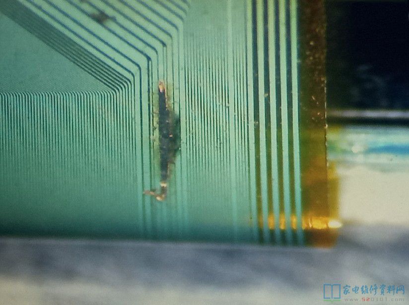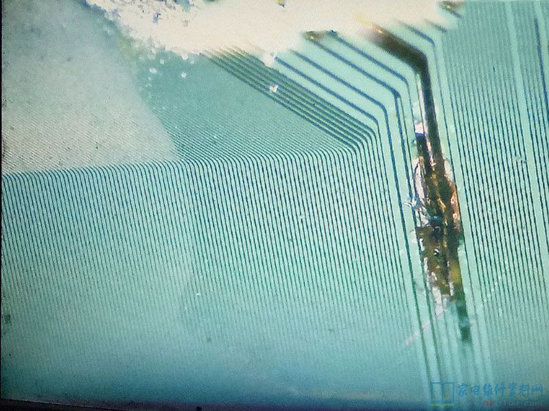 近期接休一台42寸的液晶电视,故障是开机灰屏。后来拆机检测VGH/VGL电压为0V,经检测查出VGH/VGL之间电路阻值非常小接近短路。凭经验判断大多为边板到屏的TAB软排线漏电短路,随就拿起我的高精密显微镜进行进一步检查,具体请看下图。