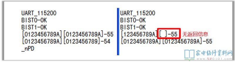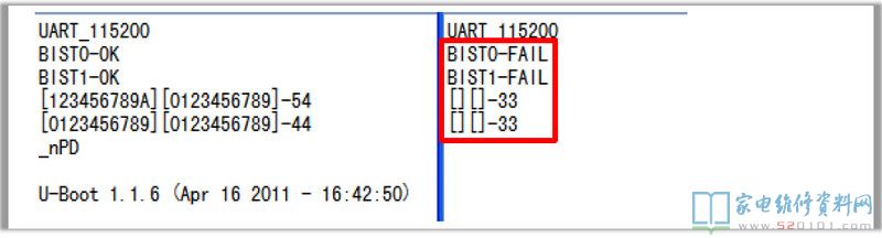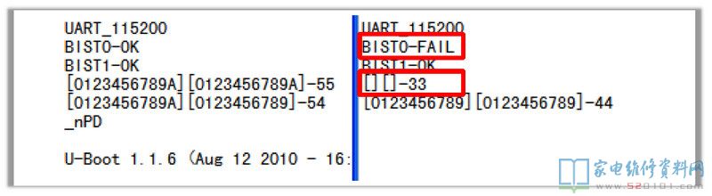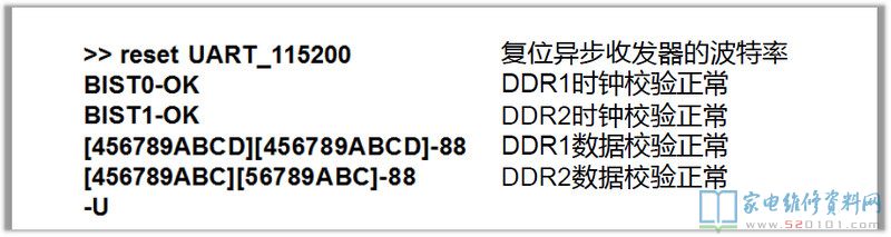 第二、三行显示两颗DDR均检测失败,第四五行显示两颗DDR均没有收到来自主芯片的信息,测量DDR供电正常,故障范围可以判断主芯片不良或是虚焊,修复后证实主芯片损坏。(DDR供电短路也会引起上述打印信息)