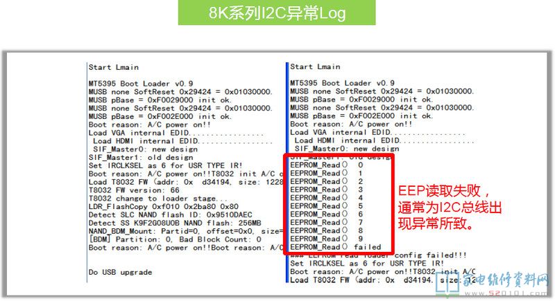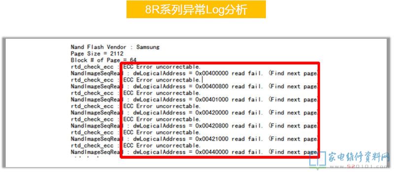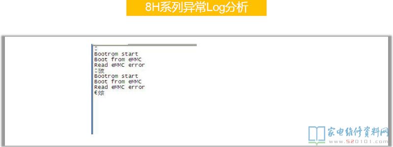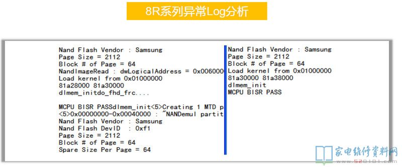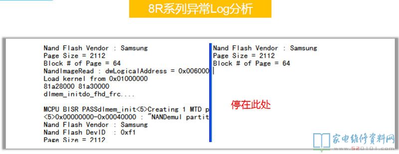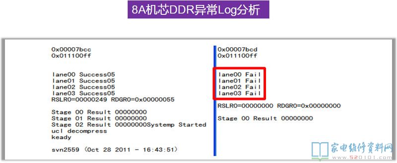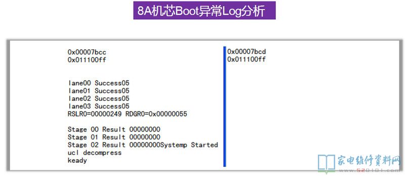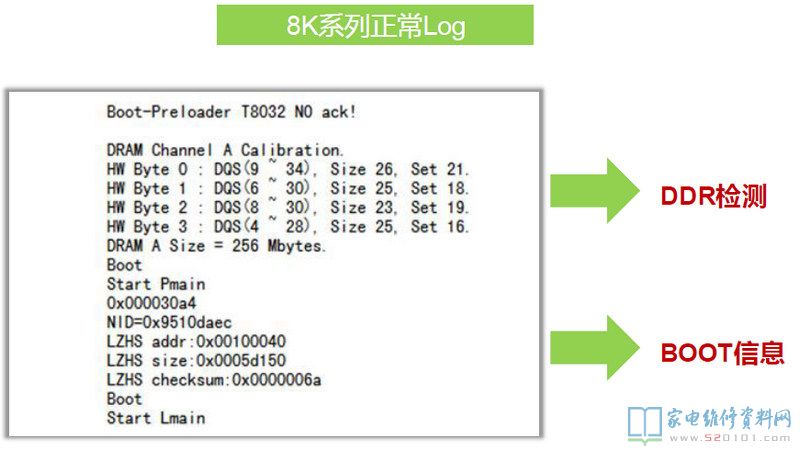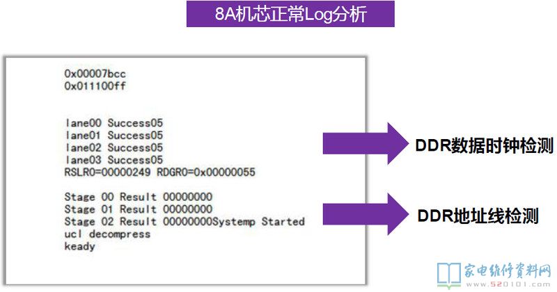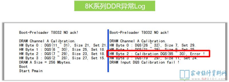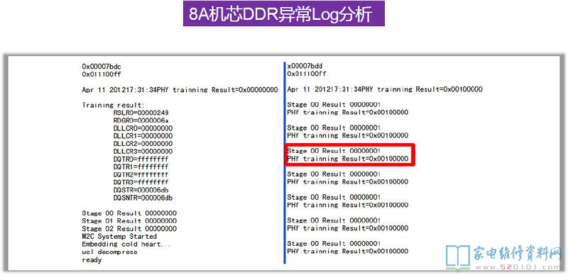 在8R6X机芯上第一颗DDR出问题是不会有任何信息出来的,8R9X上则会打印一个H。上图为8R6X的Log中,前面是有打印的,问题出在第二颗DDR上,CPU和它的通讯有问题。