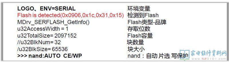 打印信息显示:机器已经顺利检过DDR、U-BOOT,当开始跑到NAND的时候却发现无法识别FLASH,无法读取FLASH数据。这种情况一般升级主程序即可。如果无法升级则要检查NAND是否正常。