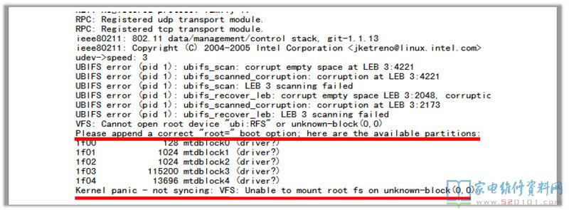 无法挂载root, flash有不识别的区。这种一般为NAND或EMMC自身损坏所致,须更换。