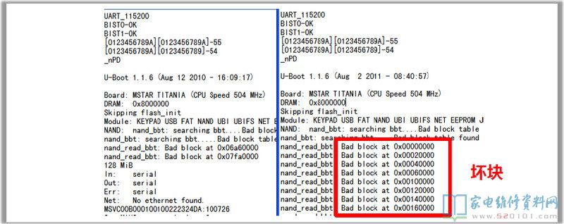 右边显示BAD BLOCK,即NAND有坏块的意思。这种情况需要更换NAND。