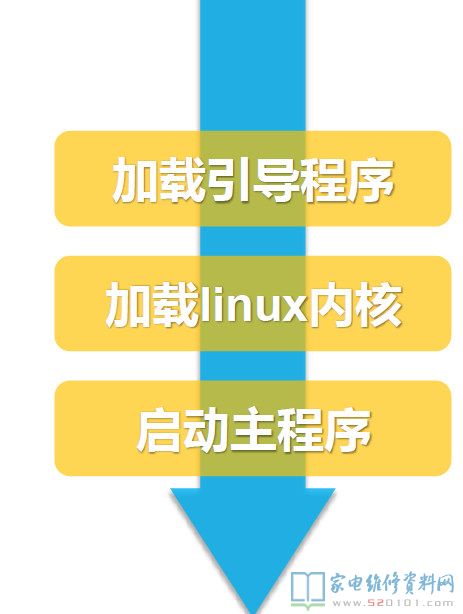 启动流程为:加载引导程序 ->加载linux内核 ->启动主程序