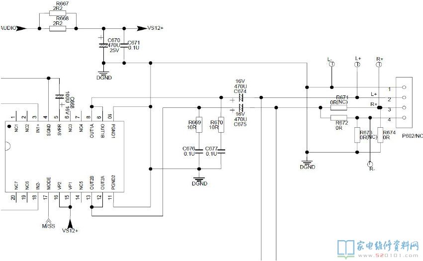 输入的图像,伴音中频信号直接进入MST9U19JS进行中频处理后,由71、72脚输出伴音信号到伴音功放电路。左右声道的伴音信号经U603(TDA1517ATW)的3、18脚输入。输入的伴音信号经TDA1517ATW功率放大器后,由8、9脚输出左声道音频信号到左喇叭进行功率放大;由12、13脚输出右声道音频信号到右喇叭进行功率放大;IC的供电电压脚:15、16脚为12V电压供电。