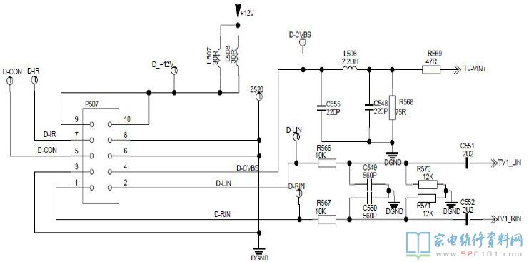 经高频信号处理后的TV信号,由排插P507的4脚输出TV视频信号,P507的1,2脚输出左,右声道音频信号。TV-VIN+信号输入到MST9U19JS的34脚输入。TV-LIN,TV-RIN分别输入到MST9U19JS的62,63脚输入。
