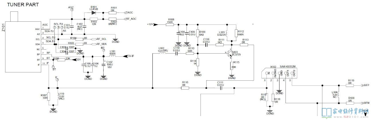 首先,高频信号处理及选择,天线调频电视信号,输入到高频调谐器TU,经TU内部处理:高频放大,滤波,中放,检波,鉴频,预中放,AGC增益控制,AFT自动频率控制,PLL锁相环滤波等电路。TU输出的图像中频信号由11脚输出,经R107,L119滤波后,输入到声表面滤波器X101(SAW-K6274D)进行滤波处理。由X101的4,5脚输出图像中频信号直接进入到MST9U19JS的51,52脚进行图像中频处理。由高频头的11脚输出的图像中频信号另一路进入声表面滤波器X102(SAW-K9352M),由X102的4,5脚输出图像伴音中频信号直接进入MST9U19JS的49,50脚进行伴音中频处理。