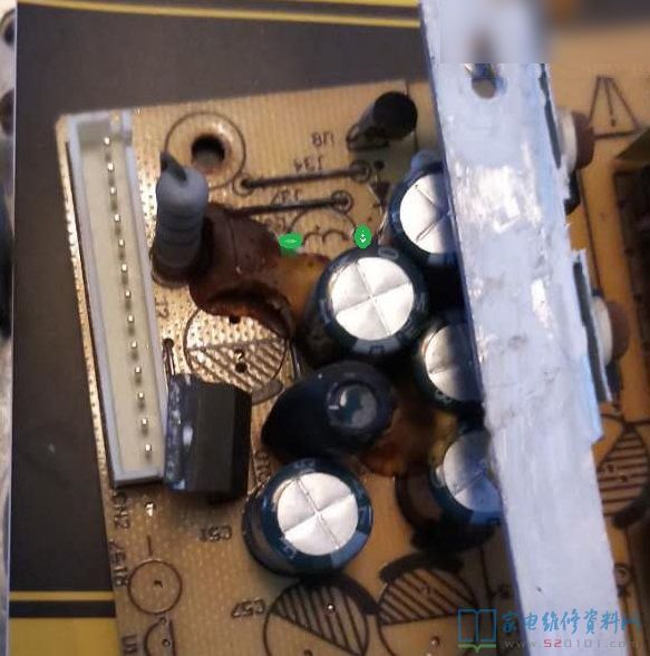 接修一台牌子是“WOO”的杂牌液晶机,尺寸LCD-32寸,以前买来2千多块钱。保修标签都未拆,质量还可以,后盖螺丝帽都生锈了,竟然还从来没有修过。拆开机器,首先外观检查没有发现烧坏痕迹,保险完好,大电容有电压325V,各散热器上面的零件以及整流二极管等检查无击穿,由于主板待机5V都没有,所以检查的重点转移到电容,刚拆掉一个5V滤波电容就发现一坨胶水附近的电感松动,再一拔发现尽然引脚断了,这种电感如此的粗,居然液会断,有点想不通,难道因为胶水的问题,也没有去想那么多了,赶紧装好电容,问题估计也就是这个电感开路导致,由于没有携带类似电感,直接把引脚拔出来一点,将就着继续使用,装上开机正常,顺路补焊了一些地方,维修完成,下图中绿点为电感两个引脚,贴近胶水的一个引脚断了。