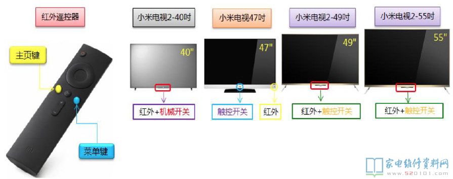 2、关机状态:同时按住遥控器的“主页”和“菜单”键,并对准TV 上的红外接收处【型号 差异,红外接收位置也有差异-如下图】,根据具体型号选择相应的开机方式进入。