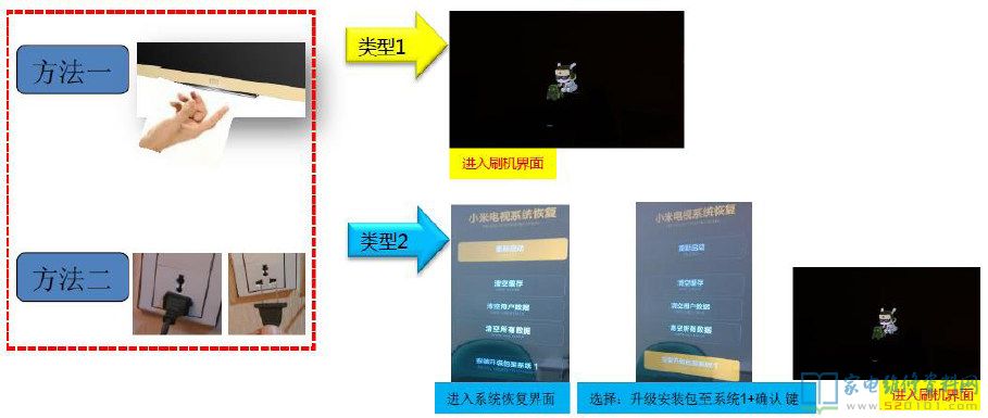 3、按TV的MI 下巴或拔插电源进行开机。在此期间不要松开遥控器,直至出现类型1或类型2图片所示刷机界面后方可松开。类型一已进入正常刷机界面;类型2需要按如下操作进入刷机界面。