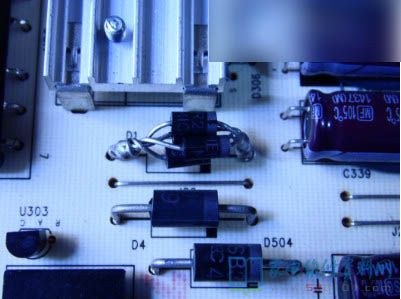 接修一台富可视IC-50P800液晶,故障表现为三无,拆机检测,首先测量电源输出待机3.3V正常,其他无输出,电源指示灯不亮,测开机POWER有开机电压。450V大电容电压400V,说明电源以开机PFC电路正常。按以往的习惯,更换电源板完事,但是一看这板的价格不菲,现在的新机价格一落千丈,费用高了导致弃修的不少。于是决定修板。检查背光电路发现全波整流电路中有颗SB5150击穿,但是手头没有该型号的肖特基整流管,于是在旧版板上找了一颗耐压稍低的装上试机,结果一开机,机器没反应,检查刚换的二极管又坏了,不过想到刚买的HER208 电流2A,耐压1000V快恢复管,于是用几颗并联装上试机,结果试机图声正常,老化几个小时没有问题,维修结束。
