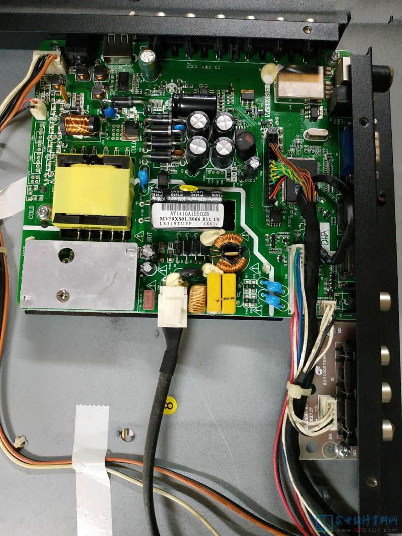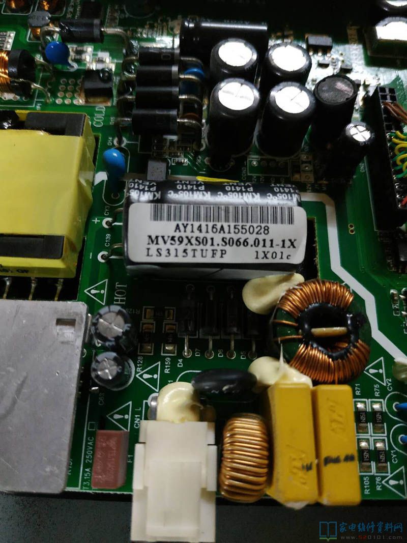 接修一台液晶电视,型号是熊猫LE32D33H,故障表现为通电不开机,拆开机器,它的主板型号是MV59XS01.S066.011-1X,屏型号是LS315TUFP11,测各路电压正常,然后刷个数据,可以开机了,故障排除。