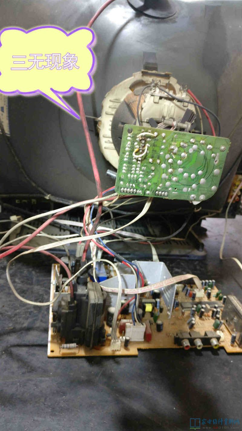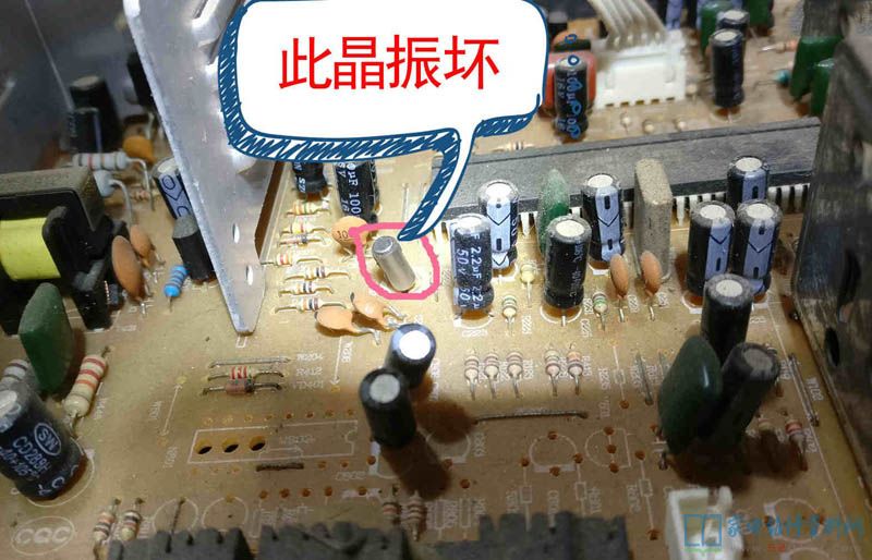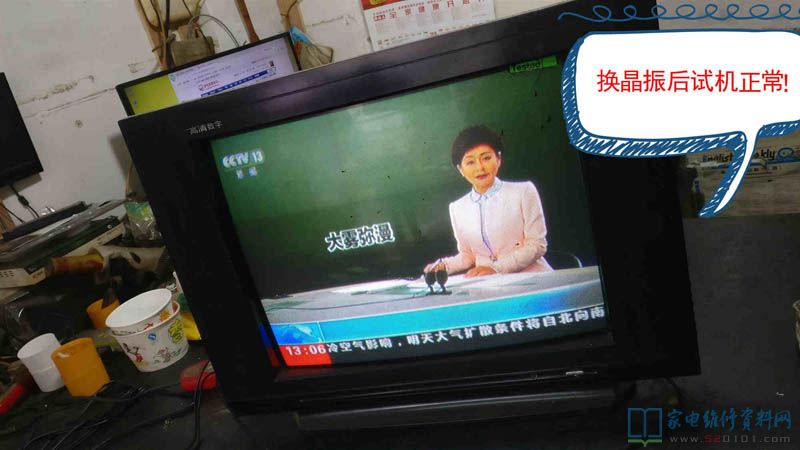 近期接修一台CRT组装机21寸的电视,上电试机,故障表现为指示灯亮,二次不启动,出现无光无声无图像。拆开机盖检查,测+B 120V正常,再测行推动管B极没有0.5V信号电压出现。查看此机使用的大块是LA76931,给其加焊无效。突然想到此机有个圆形晶振,立马更换掉。通电开机,立即见灯丝亮起,看屏幕蓝屏出现,接AV信号线,图声正常。