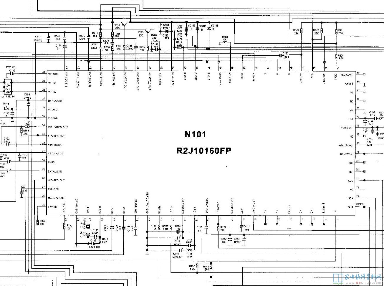 1、 主电源工作,C172上得到一个9V电压,该电压供给主芯片R2J10160G8-A012FP的54脚。