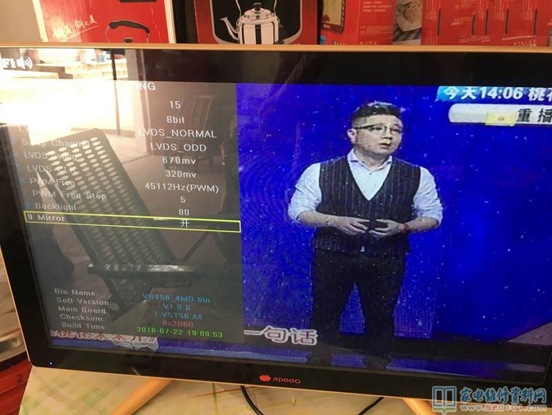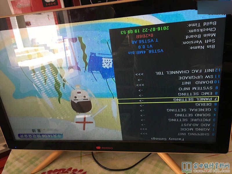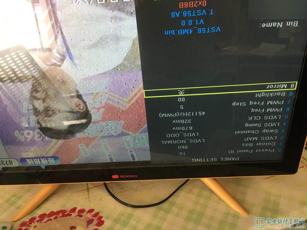 一用户送来—台杂牌液晶apeeo 30APFX04-LED电视,故障现象是图像倒置,解决方法是用遥控器按:菜单加1147、在第1页、第7项内的第9项、将:mirror“关”调成“开”即可。机器故障修复,交付用户使用。