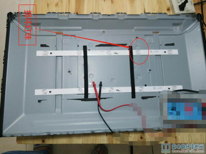接修一台某品牌32寸液晶电视有声音无背光 ,检查发现显像正常,无背光 ,该机背光两组灯条独立,然后串联后连接到一组电源上,测量一组正常,另一组没有发光。拆开屏幕,依次小心拆开扣板 、液晶屏、散光纸、就可以看到背光灯珠了,测量发现仅一只灯珠开路,反复检测中,由于反向电压过高,击穿另一只灯珠,必须更换两只LED灯珠,确定灯珠电压为四点之伏特之后,从报废液晶电视上拆下两只灯珠,更换后获得成功。让然,有条件的情况下还是建议换整根灯条,这样效果更好,毕竟新换上去的灯珠和旧灯珠的亮度不一致,会导致有白斑块。