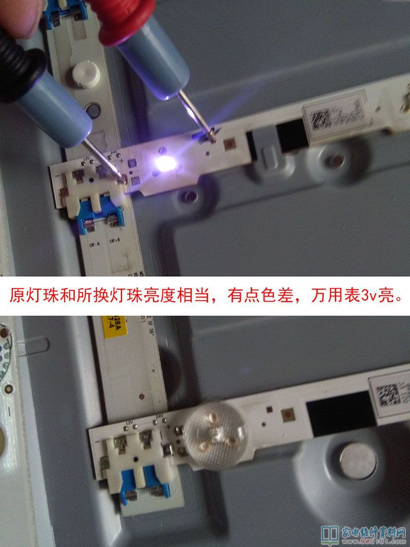 原来的灯珠和新换的灯珠亮度相当,有点色差,万用表3V亮