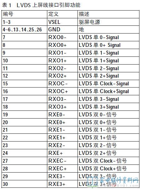 提示:在试机改装中,也可把插座CN19中“RED”、“GRN”(原本接红、绿色指示灯)改为开关电源或背光灯驱动板开/关控制信号,分别对应高、低电平有效。CN17为LVDS上屏线接口,左侧下排标有白色点的针脚为1脚,下排为1、3、5、7等奇数较为,上排为2、4、6、8等偶数较为,其引脚功能见下表1。