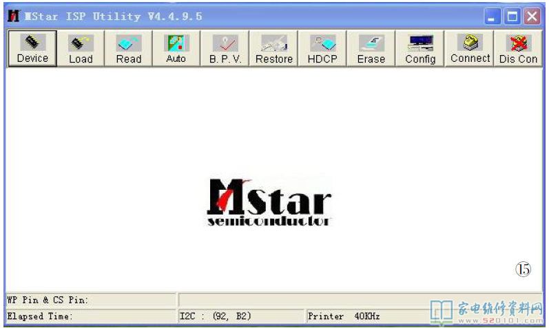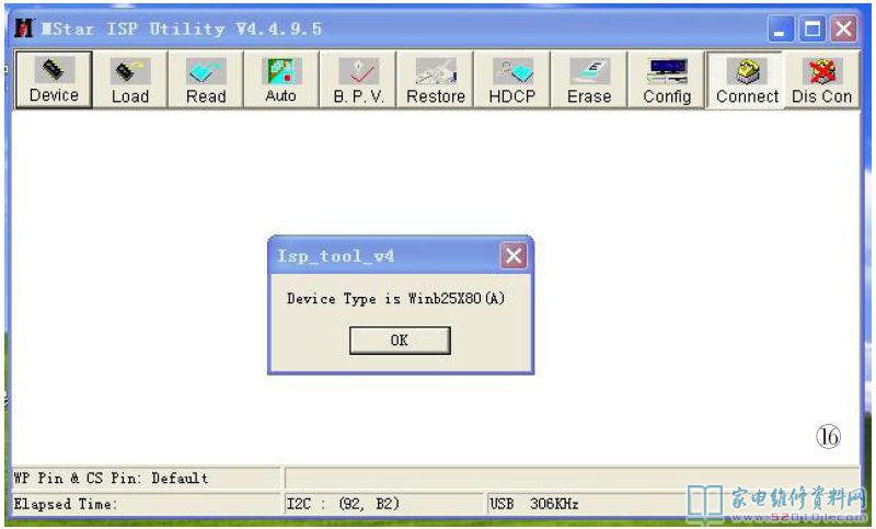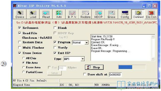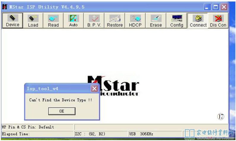 2.如图14所示,双击高清板所附光盘中的“ISP-Tool-V4.4.9.5.exe”文件,即运行升级软件。这时会出现一个升级操作界面,如图15所示,点击“connect”图标,如果驱动安装正确,且连线无误的话,这时屏上会显示高清板上的闪存(Flash)型号,如图16所示。如果界面显示如图17所示,即无法连接,这时应检查万能板供电及升级工具连线是否正常,若正常,这时可在打开升级界面的情况下,断电后重新上电再试。